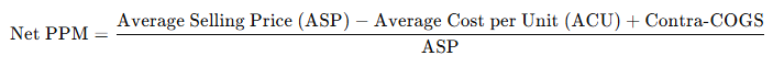 💡 Example: A vendor selling a kitchen appliance at $50 ASP, with a $40 ACU and $5 in Contra-COGS, would have a Net PPM of (50 - 40 + 5) ÷ 50 = 30%.