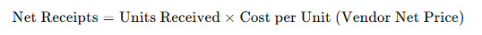 Net Receipts=Units Received × Cost per Unit (Vendor Net Price)