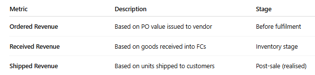 Unlike Ordered Revenue (based on POs created by Amazon) or Received Revenue (based on goods received into Amazon’s fulfilment centres), Shipped Revenue only includes units that have left Amazon’s fulfilment centres (FCs) and reached customers - making it the definitive metric for measuring sell-through and demand realisation.