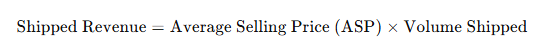 Shipped Revenue is the total sales value of units shipped to customers, calculated as ASP × Volume Shipped.