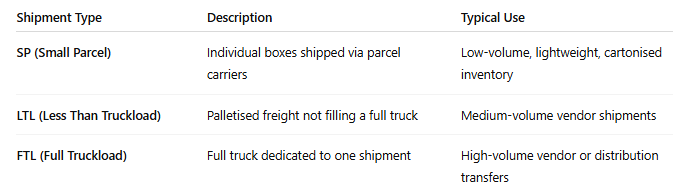 SP (Small Parcel) refers to carton-based shipments sent via parcel carriers - ideal for small, lightweight inventory that fits Amazon’s Sortable network and doesn’t require palletisation or truckload delivery.
