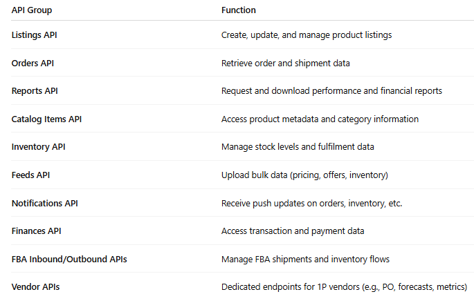 SP-API allows partners to automate workflows, analyze performance, manage catalogues, update listings, track orders, and handle financial or advertising data - all without manual use of Seller or Vendor Central dashboards.