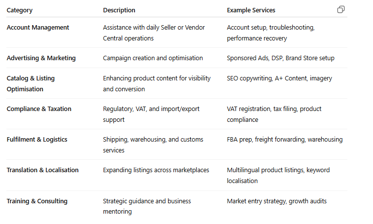 It includes agencies, consultants, and service providers that specialise in specific Amazon business areas, such as advertising, imaging, translation, tax compliance, and fulfilment.
