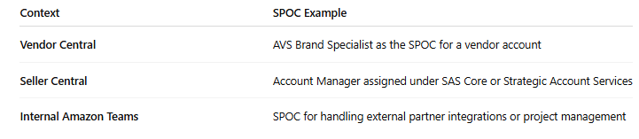 In Amazon’s retail and operational structure, a SPOC is assigned to streamline interactions between multiple stakeholders - whether that’s between vendors and Vendor Managers, sellers and account representatives, or cross-functional internal teams.