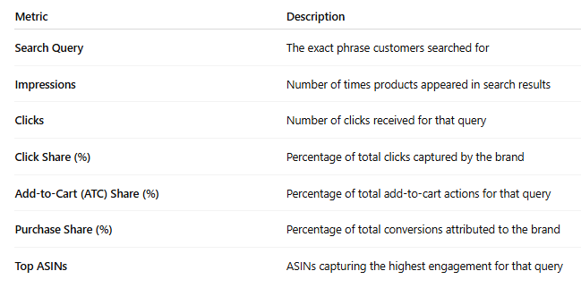 - Accessible via Seller Central, Vendor Central, or the SP-API (Selling Partner API) under Brand Metrics.