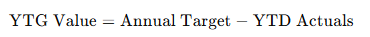 YTG complements YTD (Year to Date) by showing what is still left to achieve in the year. While YTD looks backward at cumulative performance, YTG looks forward, focusing on what needs to be delivered to hit annual targets.